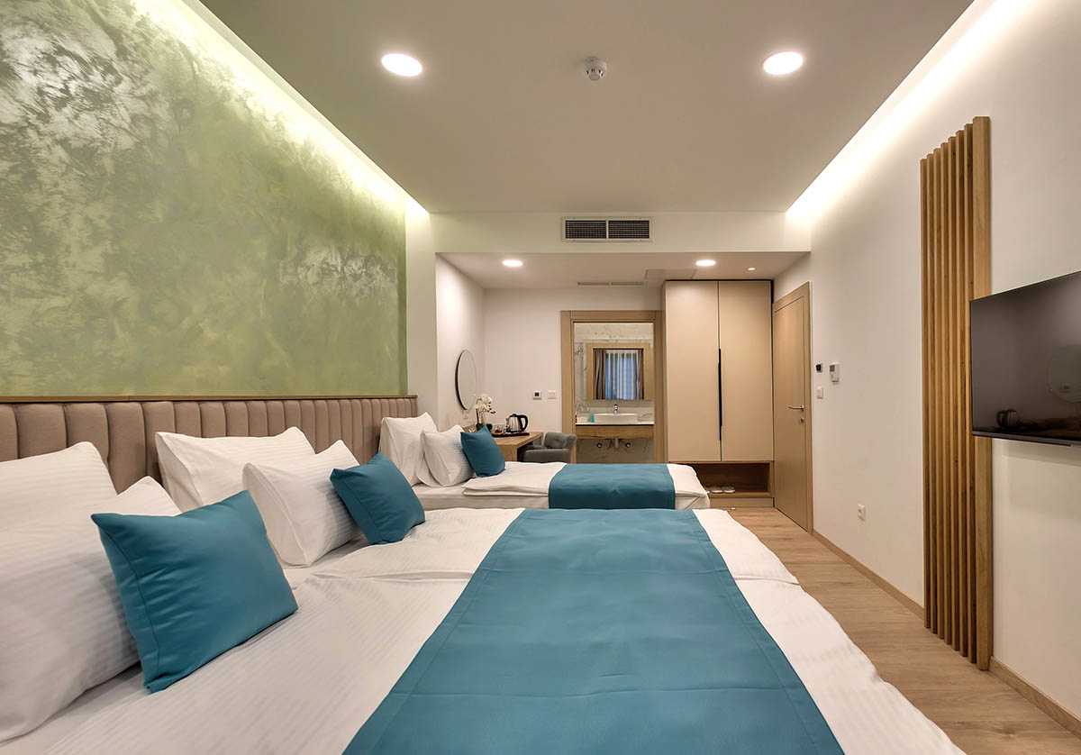 Deluxe soba sadrži bračni ležaj ili dva odvojena kreveta, single krevet, te sofu sa radnim stolom i stolicom. Pogodna je za 3 odraslih ili porodicu sa 2 odraslih i 2 djece.